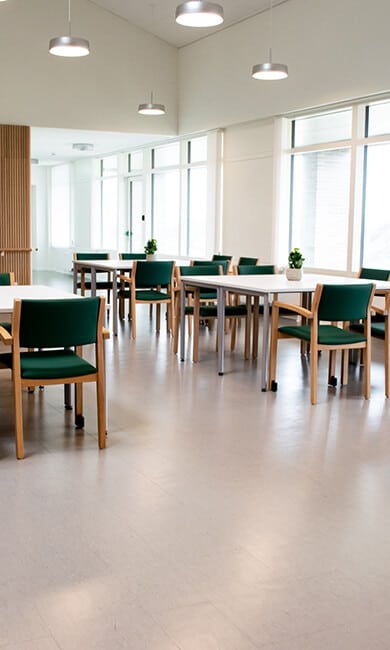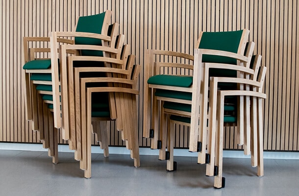 Pflegeheim ausgestattet mit dem Stapelstuhl Scala 2411 mit Armlehnen. Ein Stuhl mit besonders gutem Sitzkomfort, der Flexibilität in Räumen mit wechselndem Sitzbedarf schafft. Scala ist aus hochwertigen Materialien gefertigt, hier in einem massiven Eichenrahmen – so wird es viele Jahre halten.