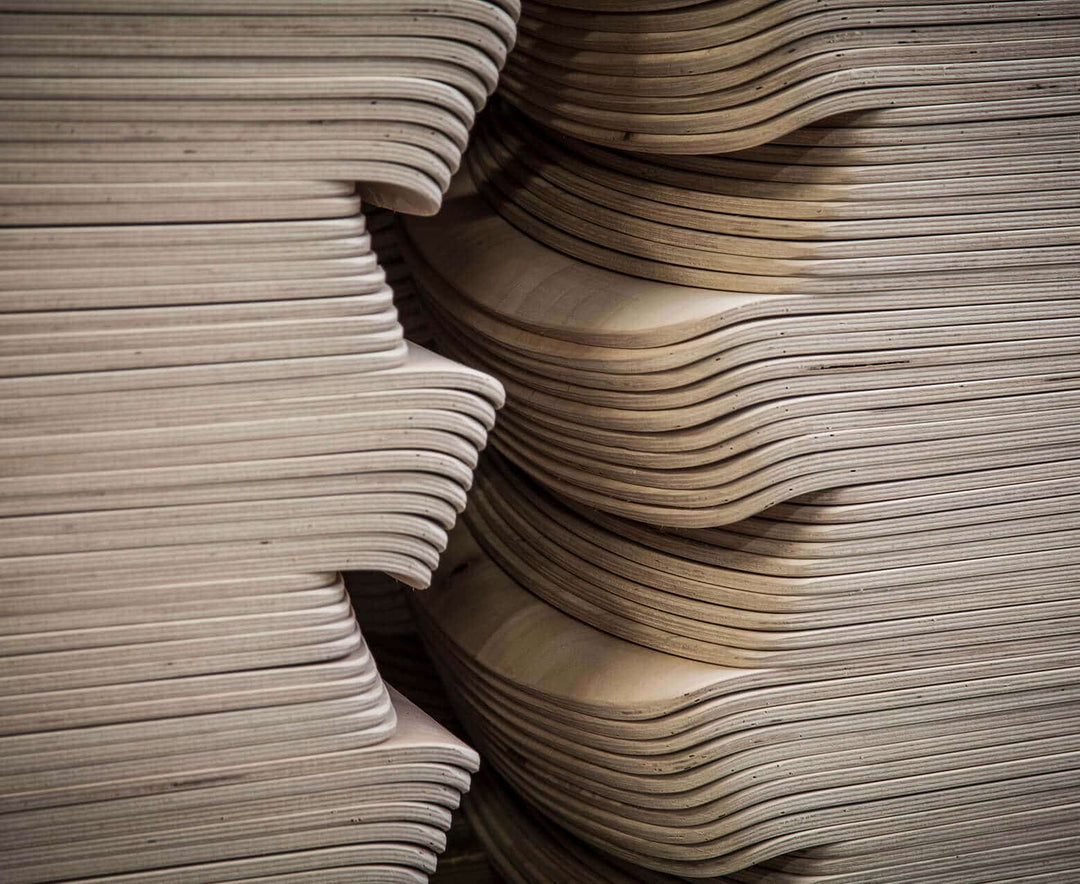 In unserer Möbelproduktion verwenden wir auch Buchen- und Eichenfurnier. Holz ist ein lebendiges Material und bei Massivholz kann es z.B. zu Problemen kommen. Luftfeuchtigkeit und Temperaturen. Durch die Verwendung von Furnier vermeiden wir Spannungen im Holz durch Feuchtigkeit und Temperaturen und erreichen gleichzeitig eine Gewichtsreduzierung des Holzes und nicht zuletzt eine sehr hohe Festigkeit. Wir formen, verleimen und erhitzen das Furnier in unserer Formpresse zu einem Stück Holz in der gewünschten Form. Die Holzform wird in Einzelteile geschnitten, geschliffen und zusammengeklebt und schon entsteht das Fundament für einen Stuhl